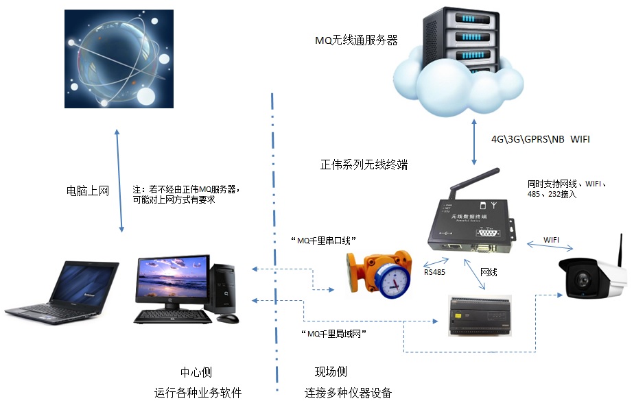 在电脑运行隐藏的正伟MQ客户端软件,使用用户名密码登录,电脑就和千里之外的现场无线终端建立连接了,您的仪器设备,在千里之外的仪器设备,就和这个电脑建立了串口通信,或者局域网通信。