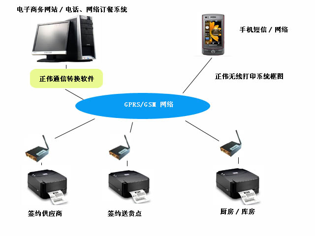 在用户原有需要实现远程无线打印功能的计算机中安装正伟的转换软件,软件生成虚拟打印接口,并将无线终端连接到原来的打印机上,即可实现通过gprs网络传输打印信息并在远端的打印机输出打印的功能。